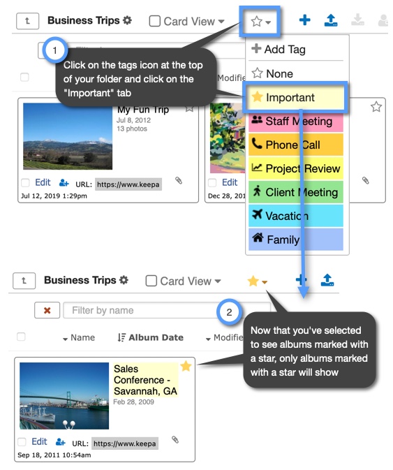 All Photo Albums have the option of being marked as “Important” by using a gold star icon. You can mark Photo Albums with a gold star either when the Photo Albums is in editing mode, or when the Photo Album is being viewed in your Folder.