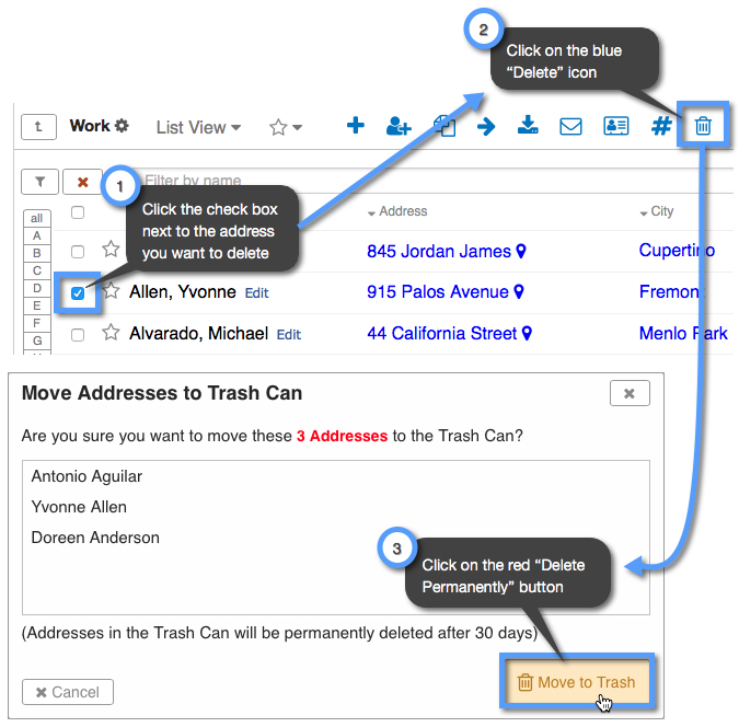 Keep&Share makes it easy for you to manage your addresses by keeping a command bar at the top of your Addresses section: Share, Copy, Move, and Delete. If you haven’t checked the box to the left of any of your addresses, many of the commands will look gray on your screen, because they are not yet “active” — there is nothing to apply them to. After the box has been checked, the commands will look blue to show that they are active & that they can be “applied” to the addresses you’ve selected.