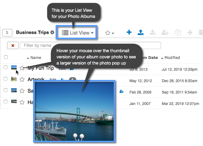 In “List View” your Photo Albums will be listed horizontally in a single column, much like if you were viewing your Photo Albums in a folder on your computer. The name of your album will be listed on the left-hand side of the screen and the date that your album was last modified will be listed on the right along with when the album was created and what folder you can find the album in. You can also hover your mouse over the thumbnail image of your album cover photo and a larger version of the photo will pop up.