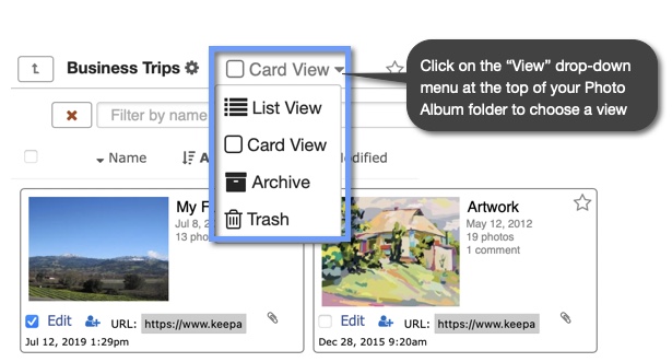 There are two different ways that you can view your Photo Albums: List View and Card View. There are benefits to using either view as they will display your albums in different ways and show different sets of information. The default view for your Photo Albums is Card View. You can switch back and forth between the two Photo Album views by clicking on the “View” drop-down menu at the top of your album folder.