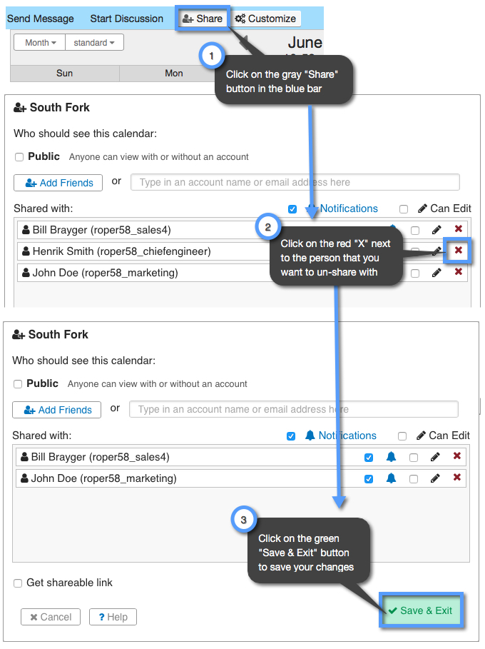 If you have shared something in your account with someone and then you no longer want that item shared with them then you will need to go back to the Share Control and remove that person. Follow the steps in the image below: