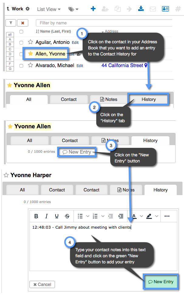 To add a follow-up task to your Contact History entries you must first create an entry. Follow the steps in the image below: