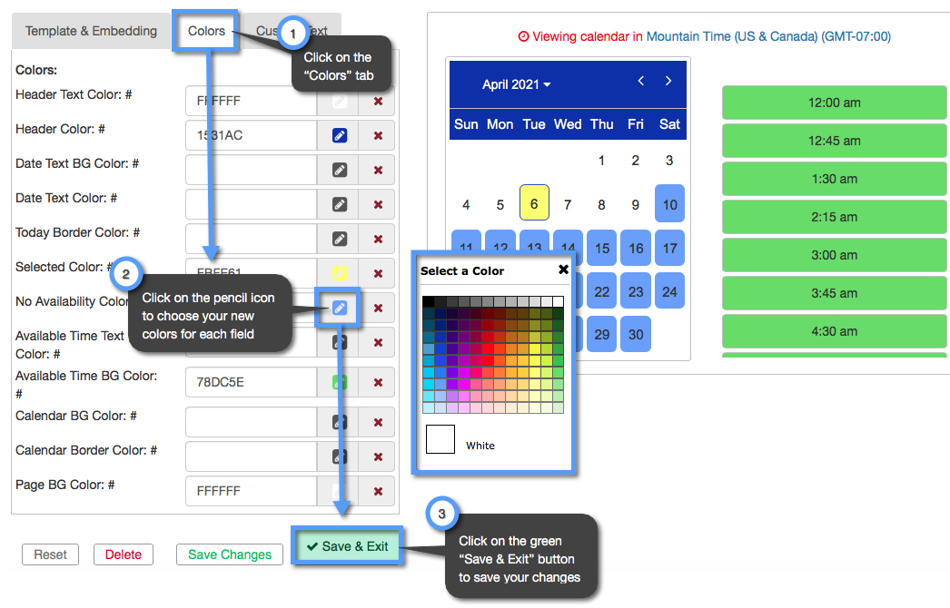 You can also customize any of the colors on the Self-Book scheduler to match your website or branding. Follow the steps in the image below: