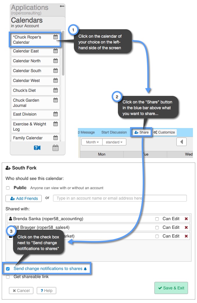 You can update your friends on changes to your calendar either by sharing notifications with fellow Keep&Share users or publishing an iCalendar feed of your calendar to friends outside of Keep&Share. If you share your Calendar and want to use Notifications to notify your friends of changes, you can either click on the checkbox next to "Notifications" at the top of the Share Control or you can click on the checkbox next to individuals if you don't want to send notifications to everyone. See the image below: